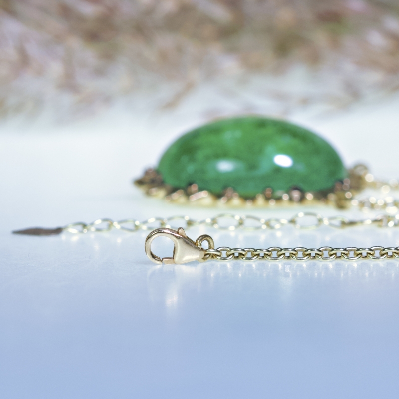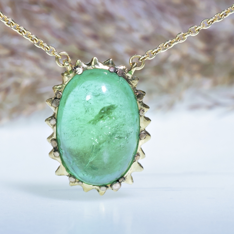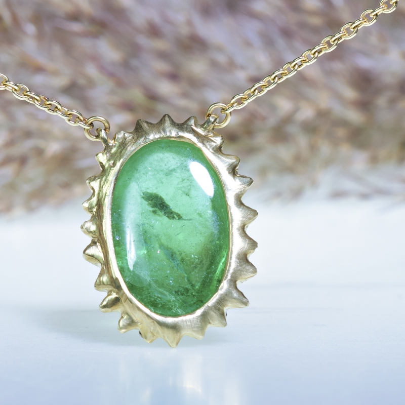 One of a kind statement SUN necklace with big oval green tourmaline with touch of blue. This tourmaline has whole universe inside and it brings very calm and peceful feeling. 14k yellow gold with details from white gold: dots around the stone and small heart in the end of the chain.