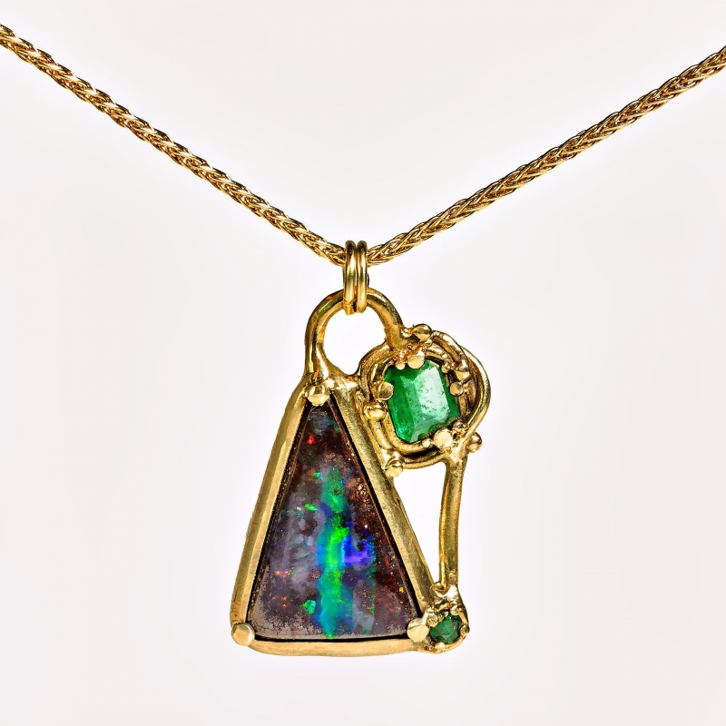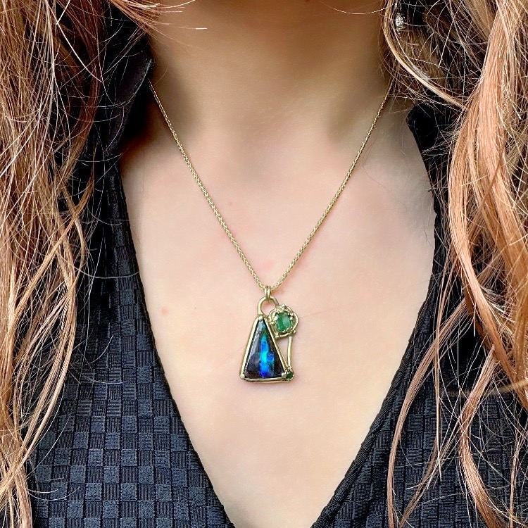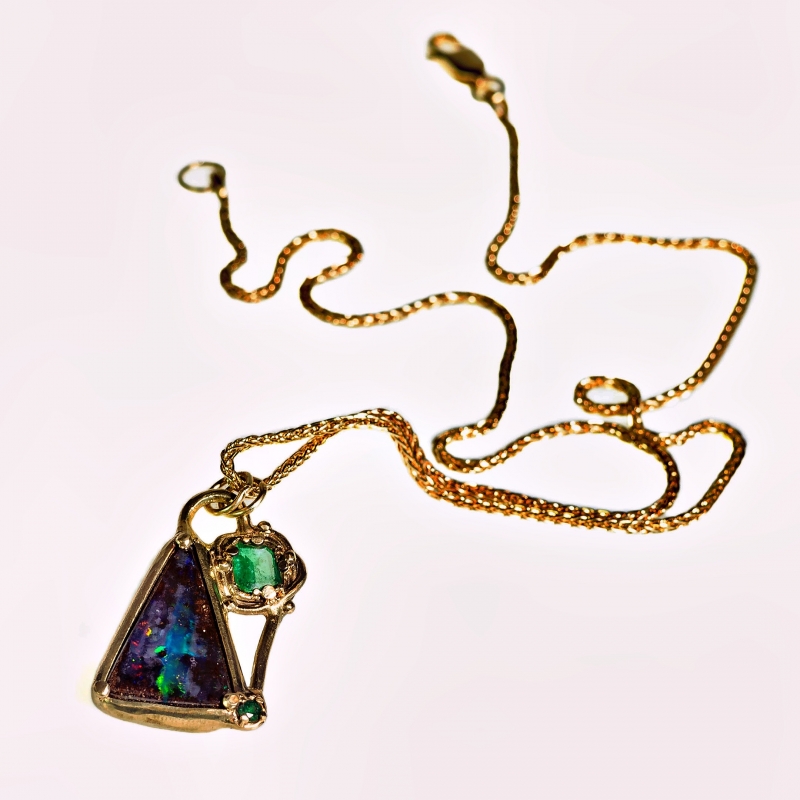 One of a kind gold necklace with triangle Boulder opal with crazy blue, green and red flashes and two emeralds. Opal comes from Broken river mining co. and has its ID number. 14k yellow gold necklace