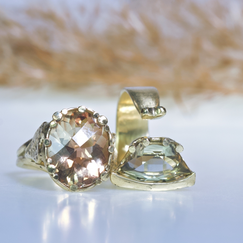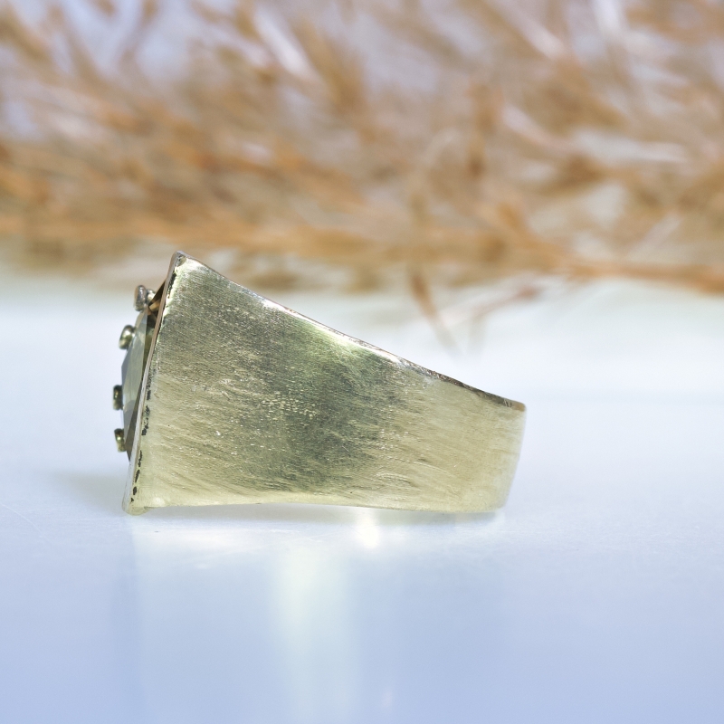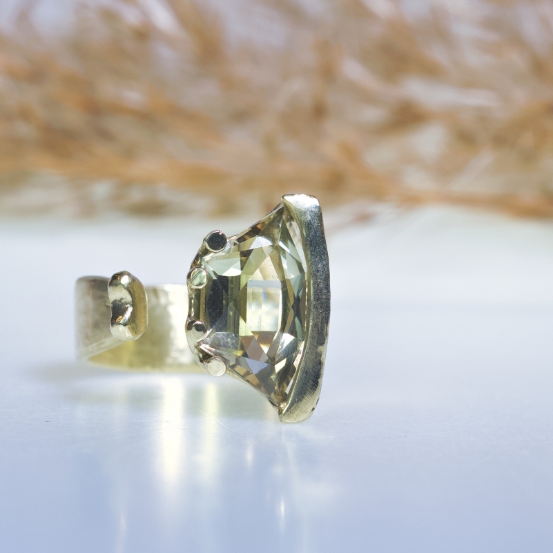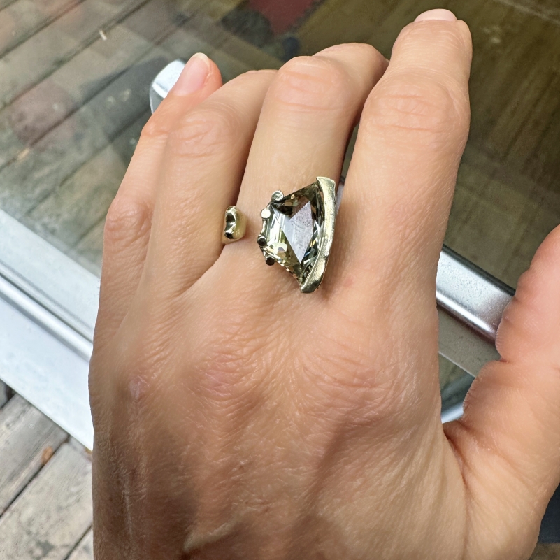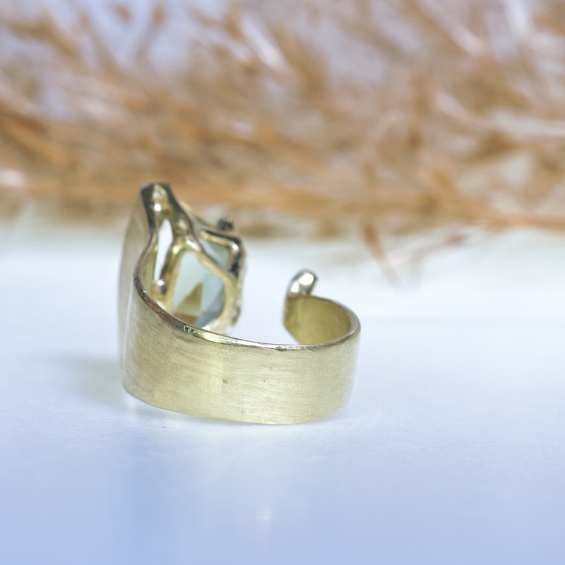 One of a kind open shape asymetric 14k gold ring with pale green Oregon sunstone and heart. Matte brush surface.