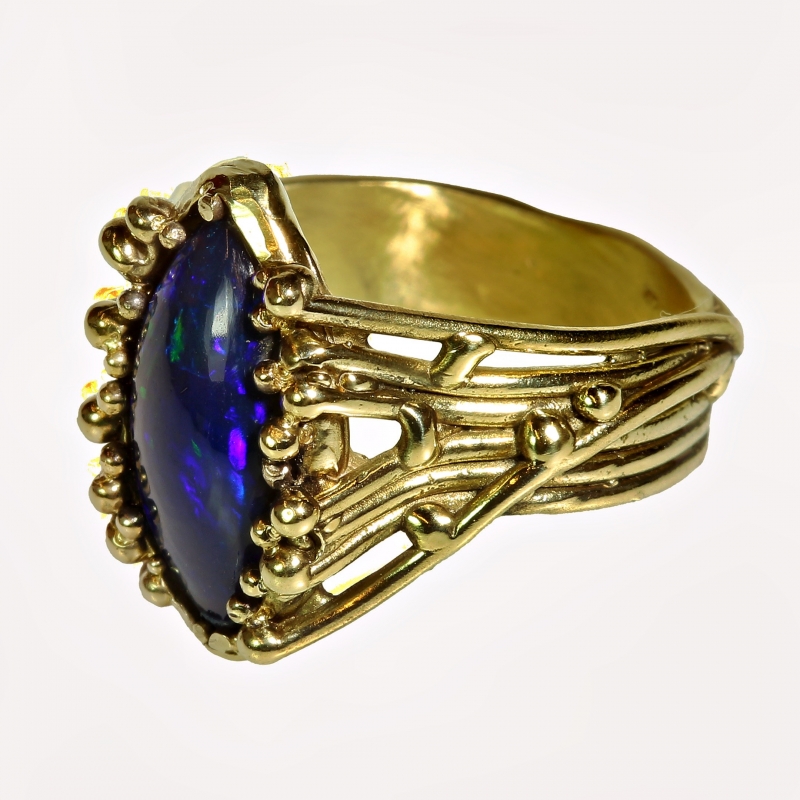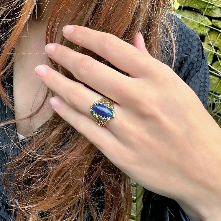 One of a kind 14k yellow gold ring with dark blue Etiopian opal. Only this one in size 52-53.