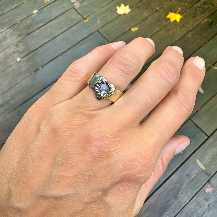 One of a kind 14k yellow gold ring with 6mm wide band, hand carved heart and rare Trapiche diamonds (asteriated).