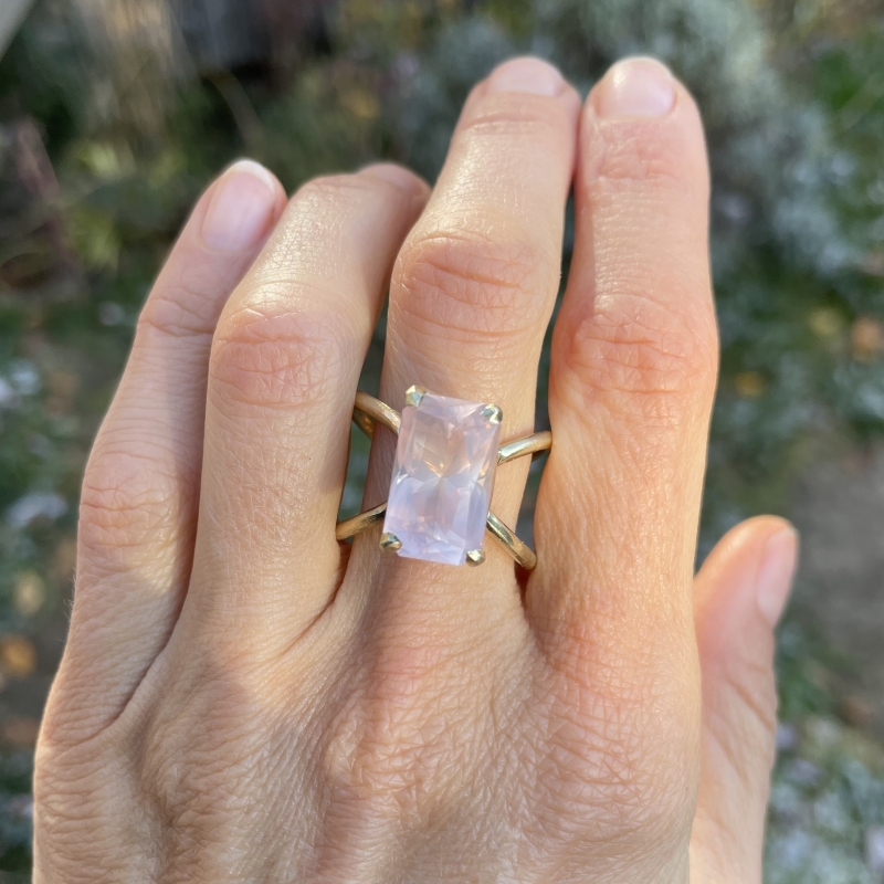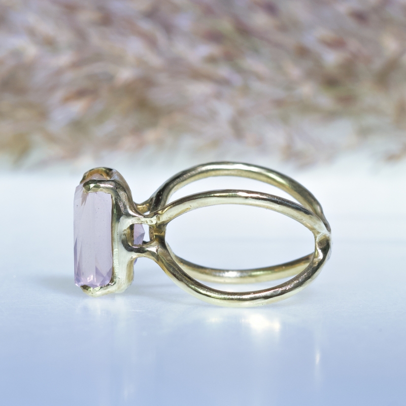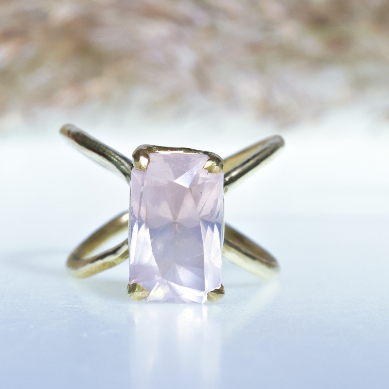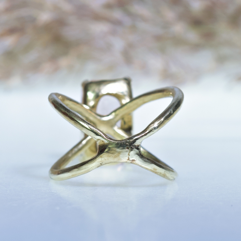 One of a kind yellow 14k gold ring with beautiful rose quartz. Original X shape band. Rose quartz is cut by David Kempný in his signature asymetric cutting. Stone comes with its certificate of origine. Only this one in size 60-61.