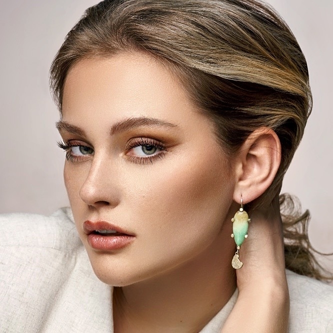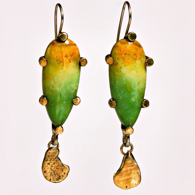 One of a kind earrings with beautiful green-gold indonesian opalized wood. 14k gold dots around the stones and gold pendant adding lovely moving to the earrings.