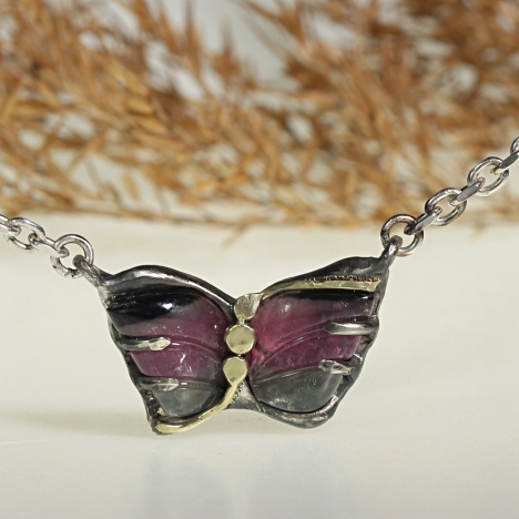 One of a kind hanging earrings with watermelone pink-green handcarved tourmaline in shape of butterfly wings. 14k gold dots. Hook or claps fastening upon your request.