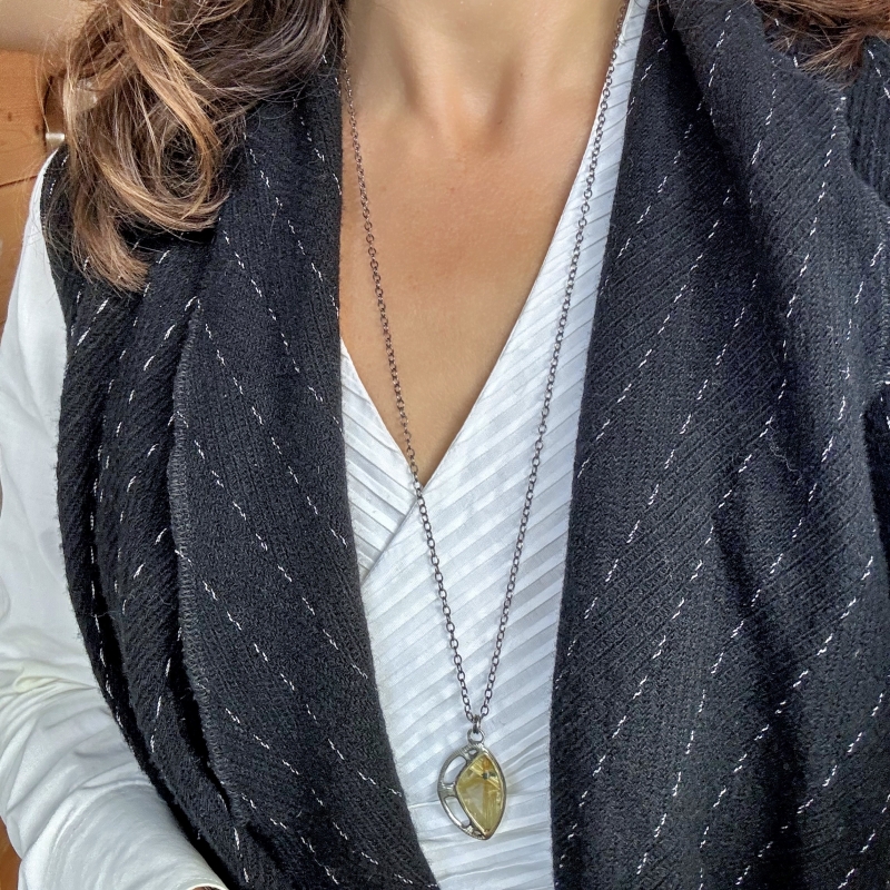 One of a kind long necklace with gold star rutile. 14k gold line around the stone. Handcarved and oxidized.
