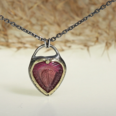 One of a kind necklace with emerald green hand carving tourmaline in shape of heart. 14k gold dots around the stones and partially gold chain. Oxidized sterling silver.