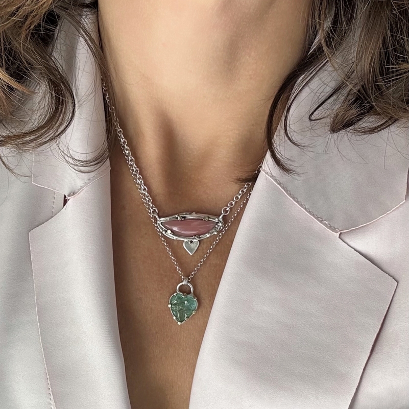 One of a kind necklace with bright green color handcarved tourmaline in shape of heart. 14k gold dots around the stone. Oxidized.