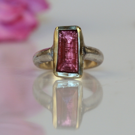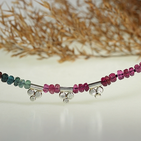 One of a kind necklace with heart shape deep pink tourmaline rubellite with hand carving. 14k gold line around the stone. Oxidizes sterling silver.