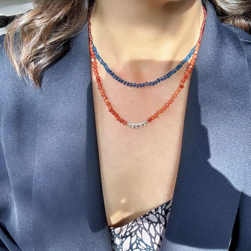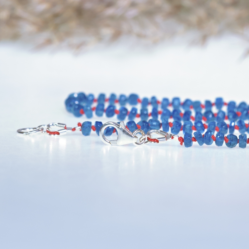 Necklace with teal blue apatit rondelles on orange silk cord.