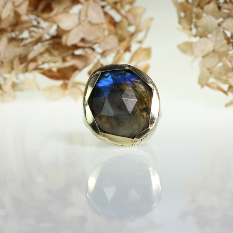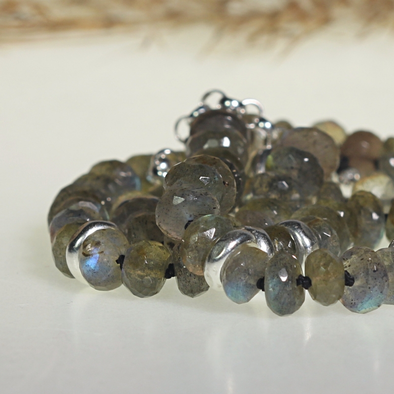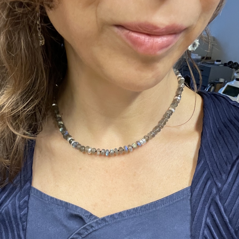One of a kind necklace with big flashy faceted labradorite rondelles. SS hammered beads.