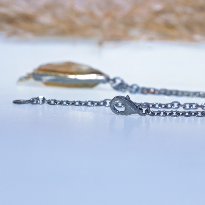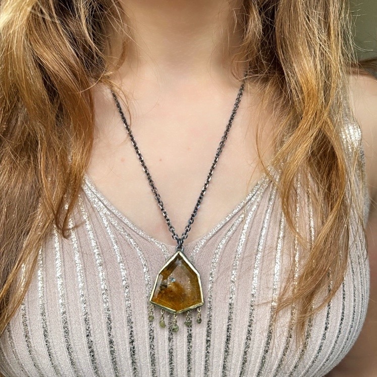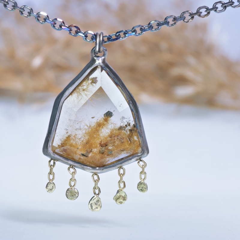 Necklace with amazing sagenite (gold rutile makes beautiful and rare inclusion in quartz). 14k gold lines around the stone and gold fringe. Oxidized.