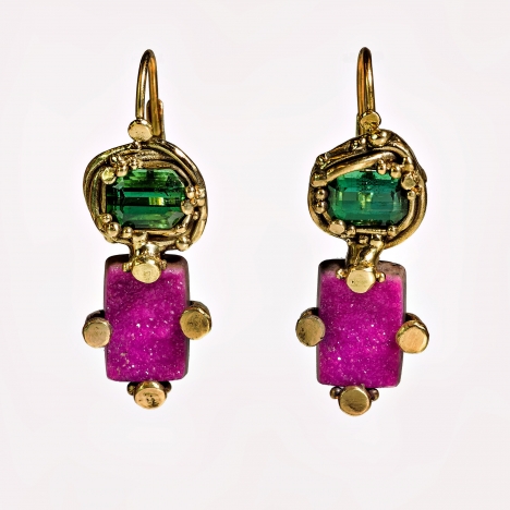 One of a kind necklace with lovely pink cobalto-calcite with natural surface and faceted morganite. Oxidized sterling silver with 14k gold combination