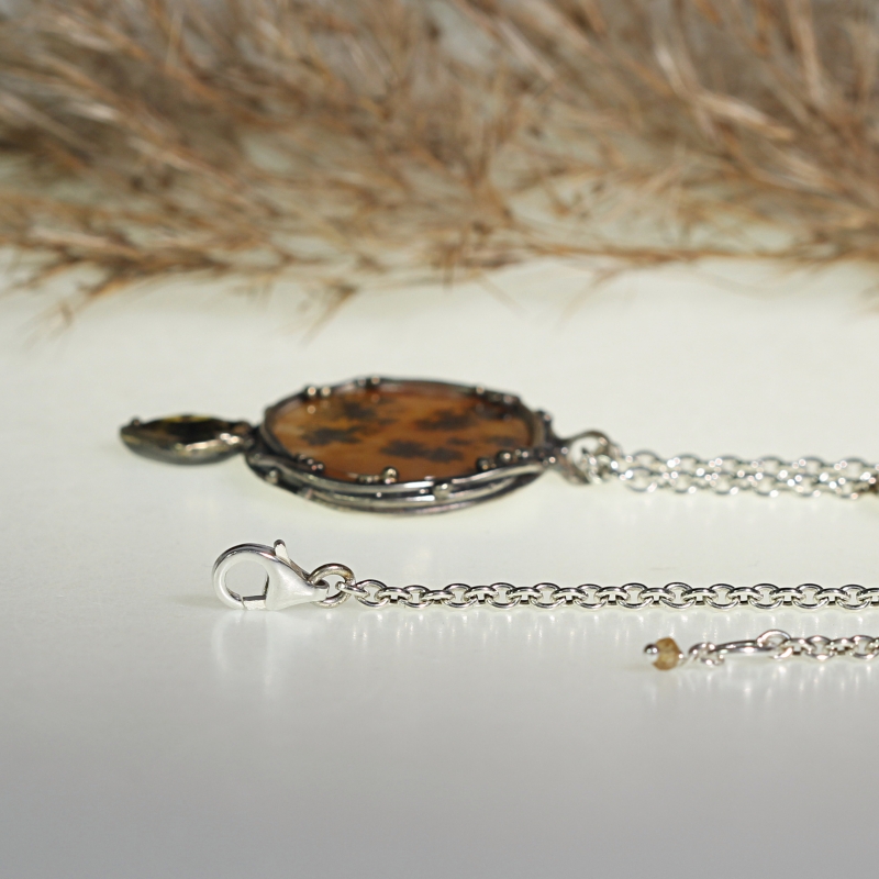 One of a kind necklace with dendritic achat in brown shades and gemetric rose cut sapphire. 14k gold details around the stones. Silver chain is combined with fire opals rondelles, brown freshwater pearls, smoky quartz and hessonite garnet rondels.