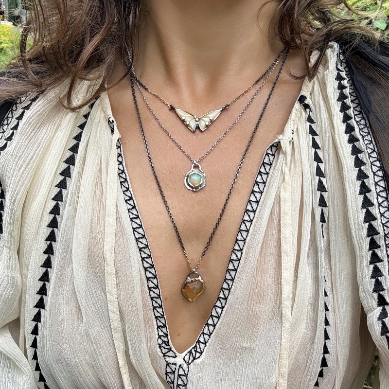 One of a kind fine necklace with hexagonal ehiopian opal. 14k yellow gold line and dot. Gently oxidized. This one has sold out but I can make a similar one on your request.