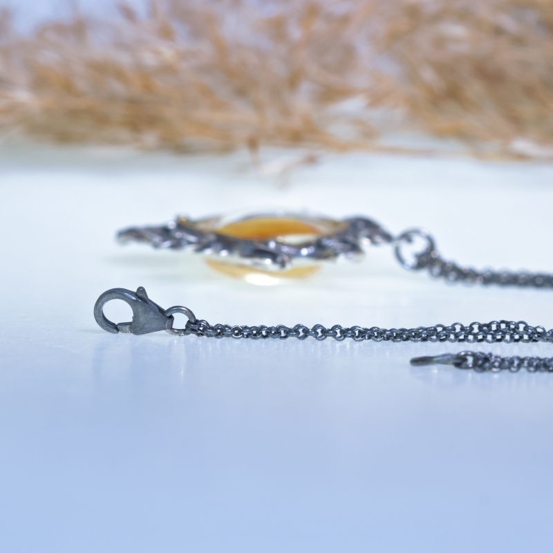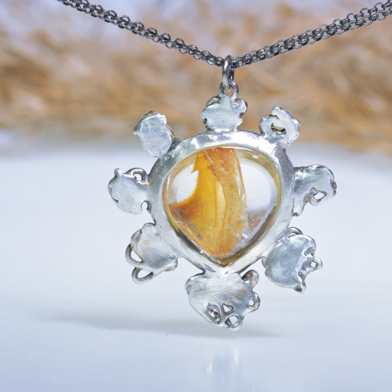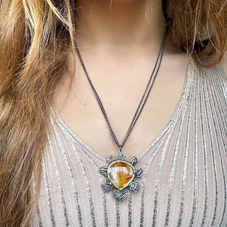Necklace with big and beautiful irone oxide crystal quartz. 14k gold line around the stone. Oxidized.