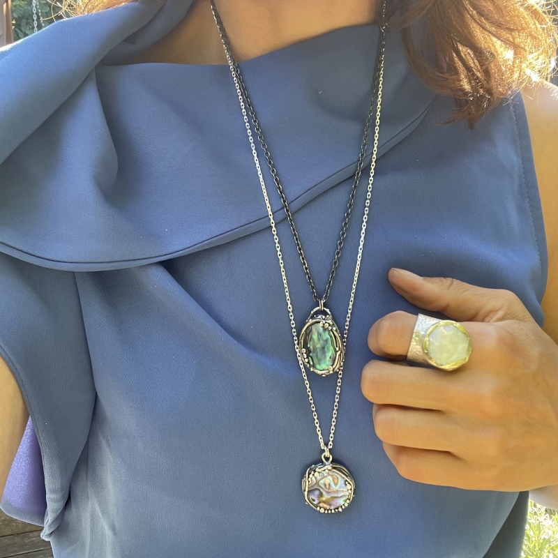 One of a kind necklace with oval seashell Paua (Ababalone). Gently oxidized.