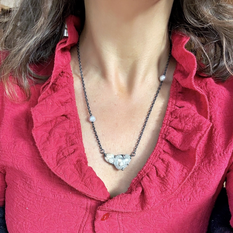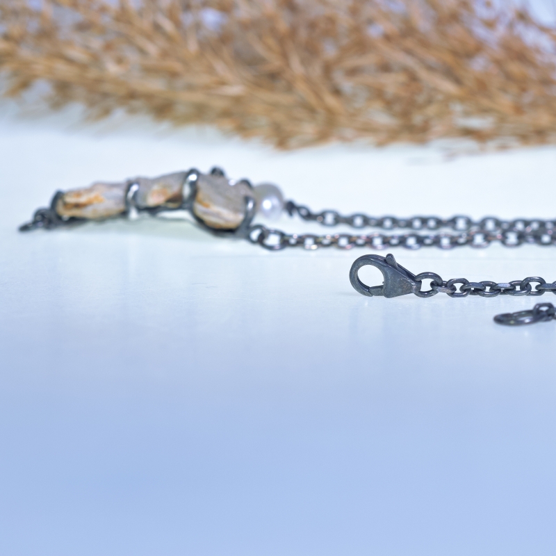 Necklace with small chalcedony rose. Oxidized chain with two grey freshawater pearls.