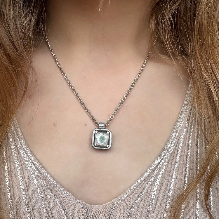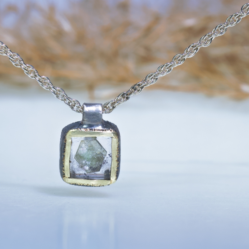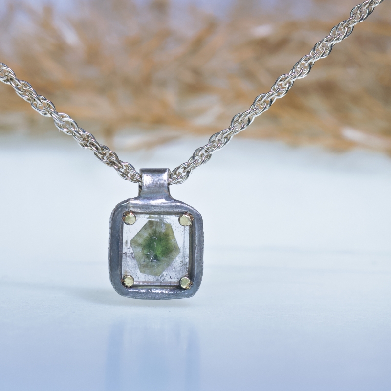 Necklace with crystal quartz with green rutile. 14k gold details around the stone. Pendant is oxidized, chain may be oxidized upon your request.