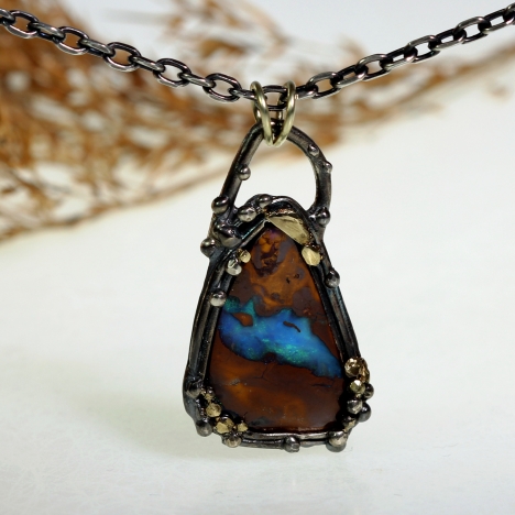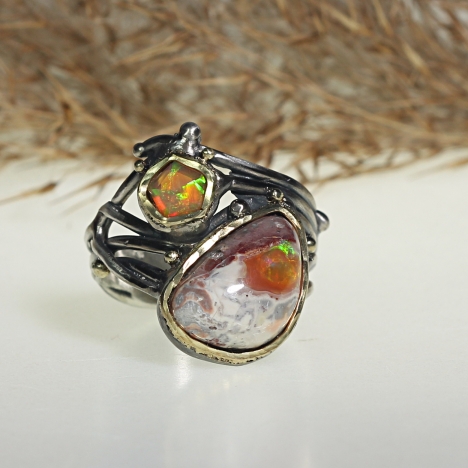 One of a kind ring with Cantera opal from Mexico. Signature original style of Galaxy collection. Red 14k gold line around the stone. Oxidized.