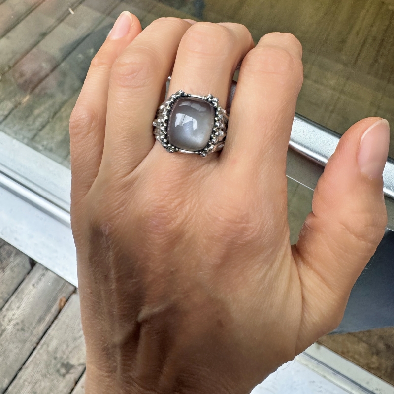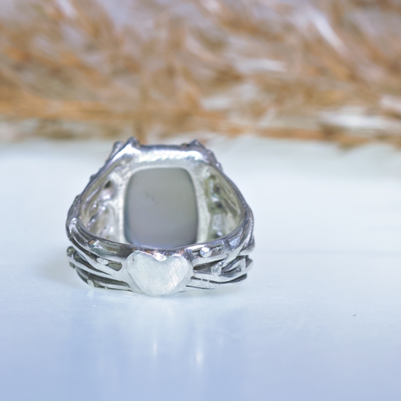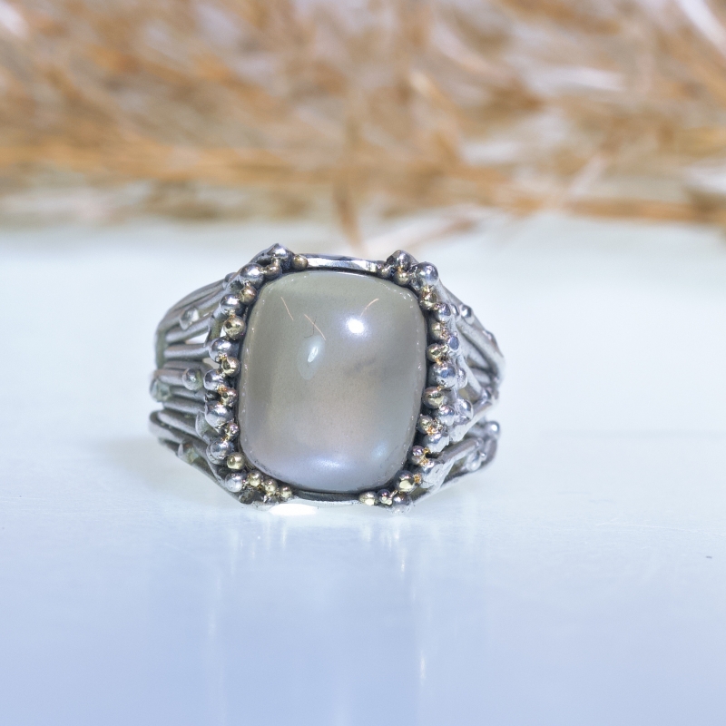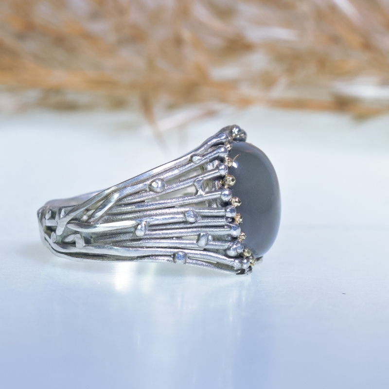 One of a kind ring from Galaxy collection with amazing grey moonstone with blue flashes. 14k gold details around the stone. May be oxidized upon your request.