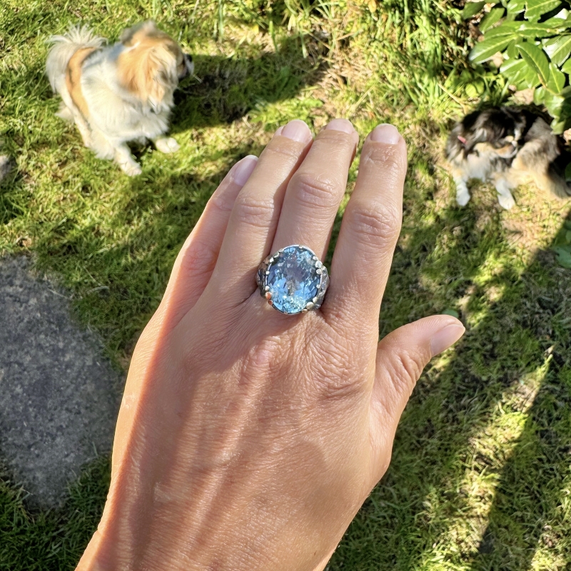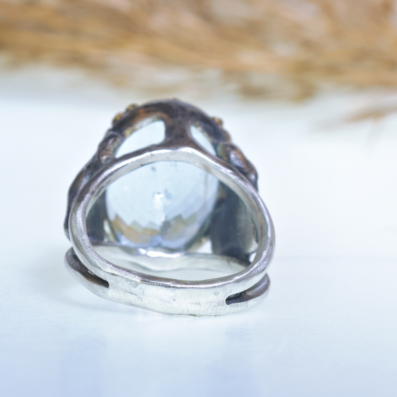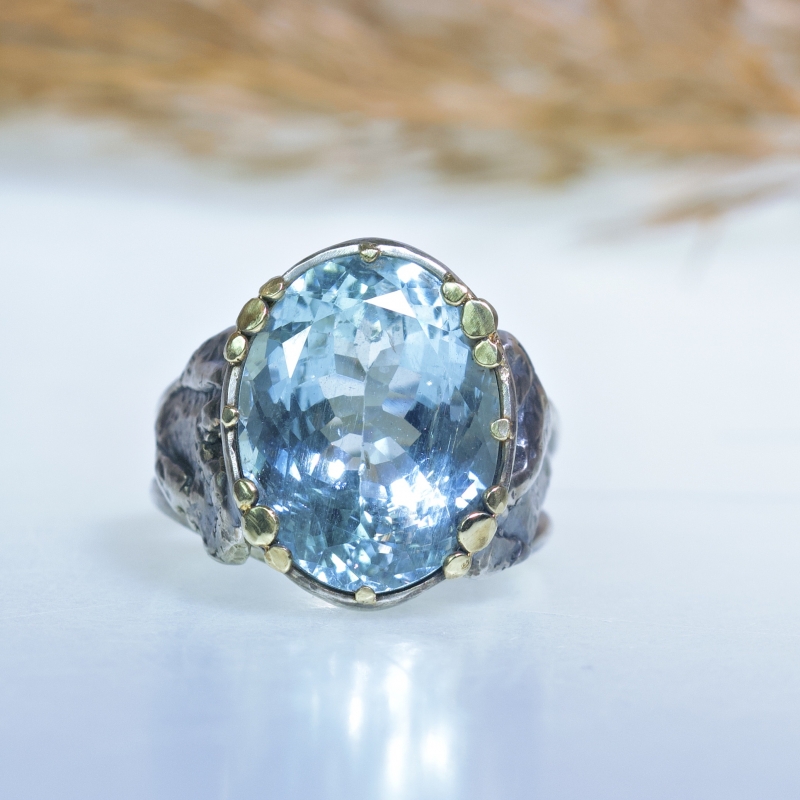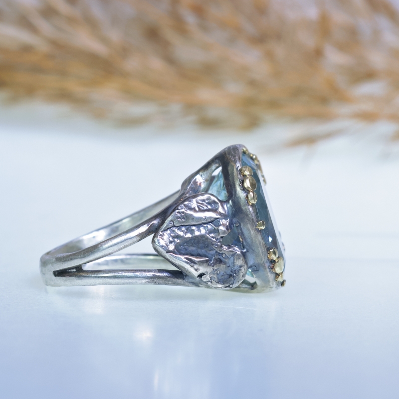One of a kind sterling silver ring with lovely faceted aquamarine. Two structrure hearts on both sides of the aquamarine. 14k gold dots around the stone, gently oxidized.