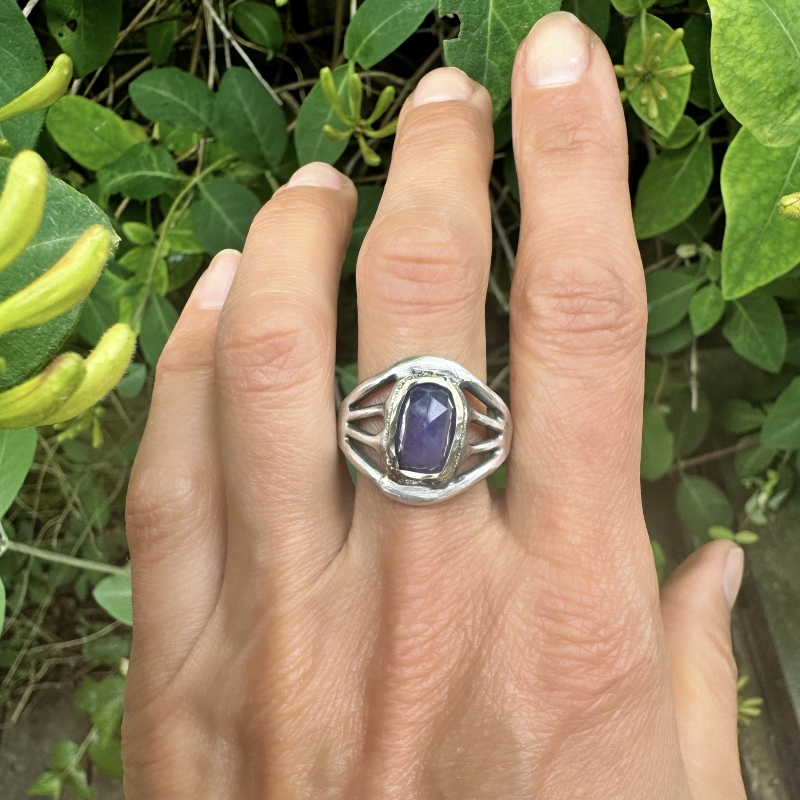 One of a kind ring with beautiful bluepurple rose cut sapphire. 14k gold line around the stone.