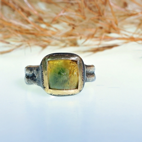 One of a kind ring with geometric rose cut sapphire from Kenya. 14k godl details around the stone.