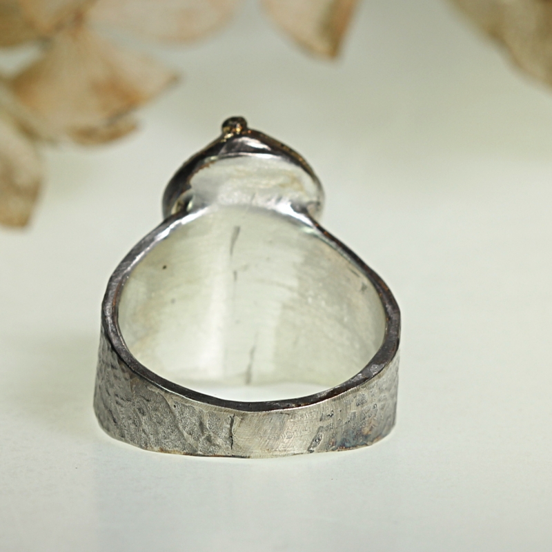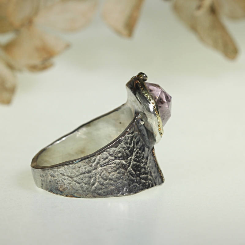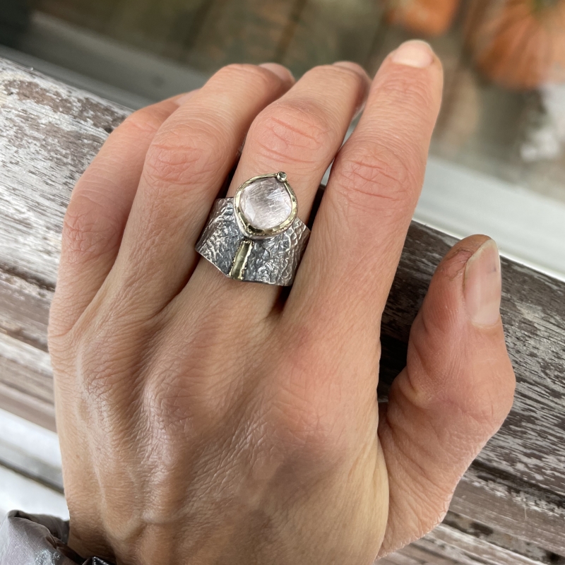 Wide ring with pale pink rose cut morganite. Signature structure wide band. Gently oxidized. 14k gold details around the stone and line on the band. Ring is app. 2cm wide on the front side. Size 58 in stock, only this one.