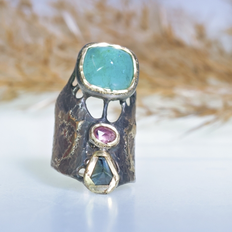 One of a kind sterling silver ring with oval bright pink color rodonite. 14k gold line and dots around the stone. Oxidized.