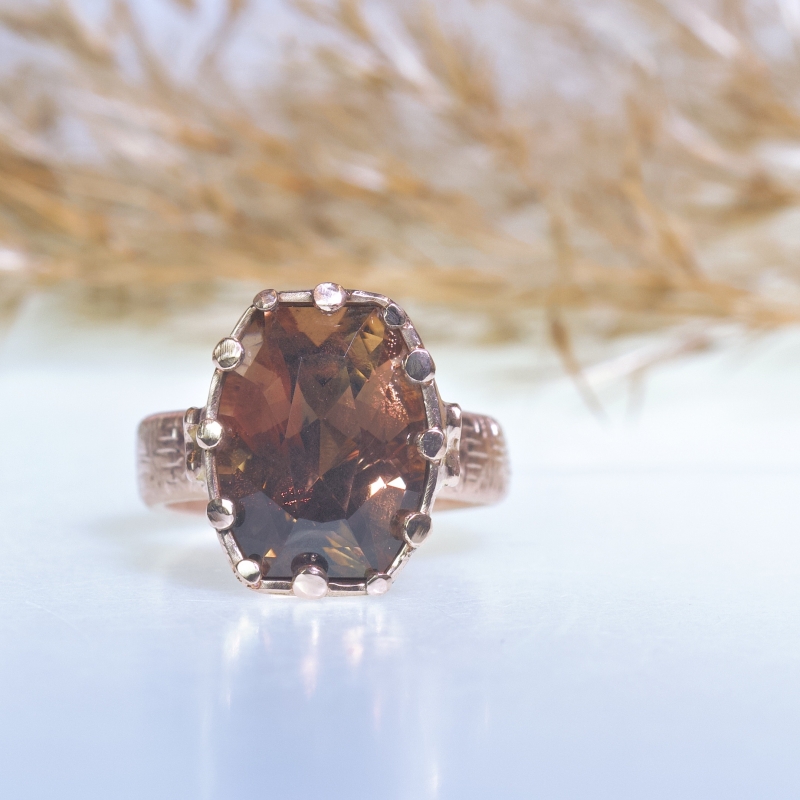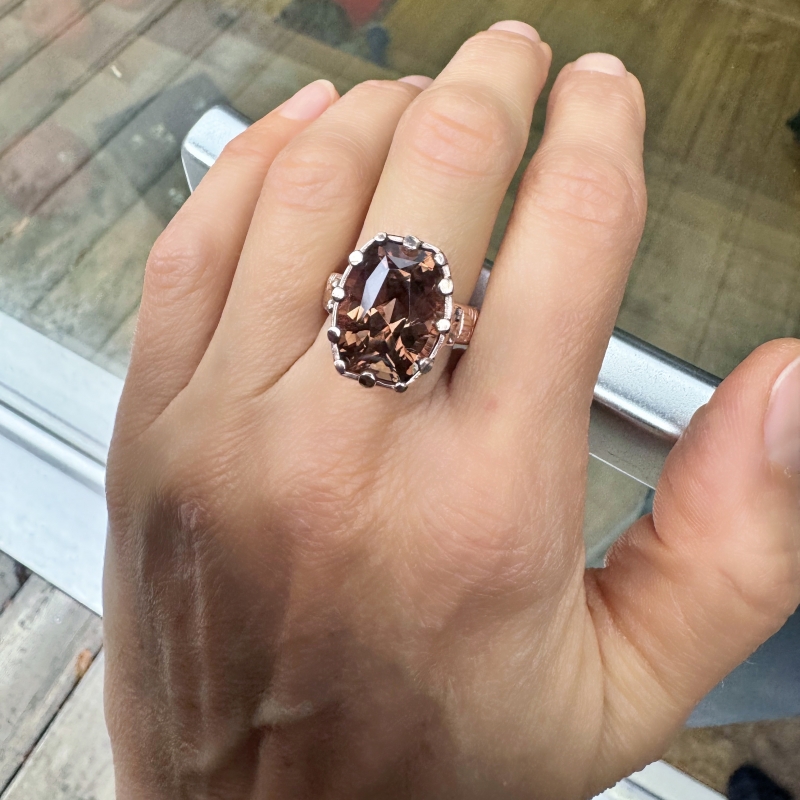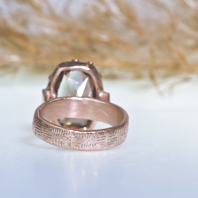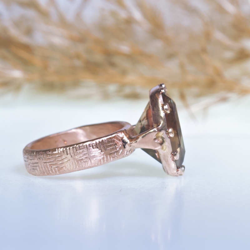 One of a kind 14k rose gold ring with orange- rust Oregon sunstone. Hand carved band. Two hearts on the side of the stone.