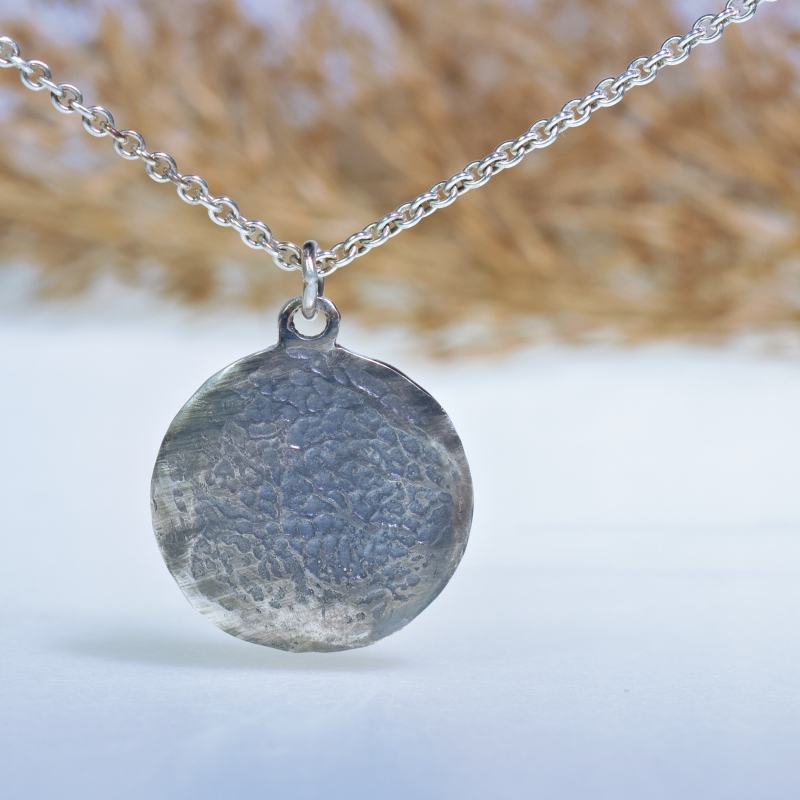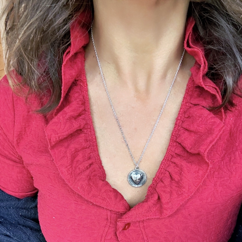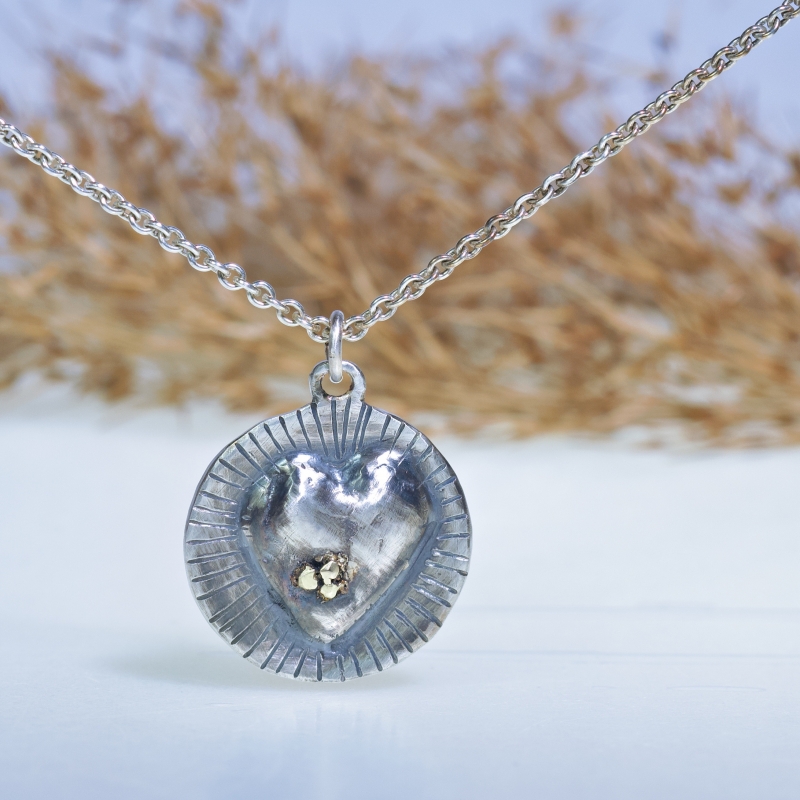 Necklace - amlulet with round pendant with hearth with three gold dots. Hand carved. May be oxidized upon your request.