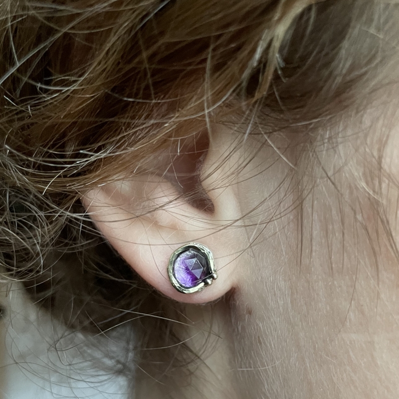 Small stud earrings with rutile rose cut amethyste. 14k gold line and dots around stones.