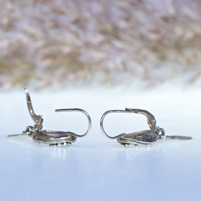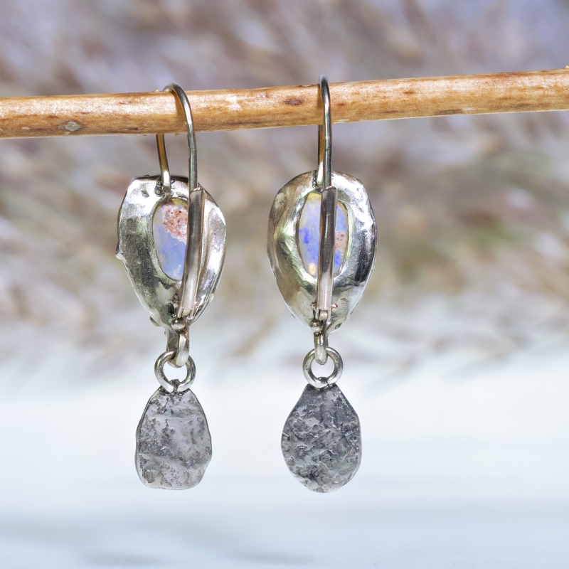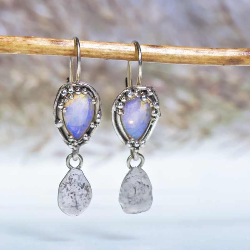 One of a kind hanging earrings with Australian crystal opals in 14k white gold. Opals have light cream color with blue and purple flashes. Claps fastenning.