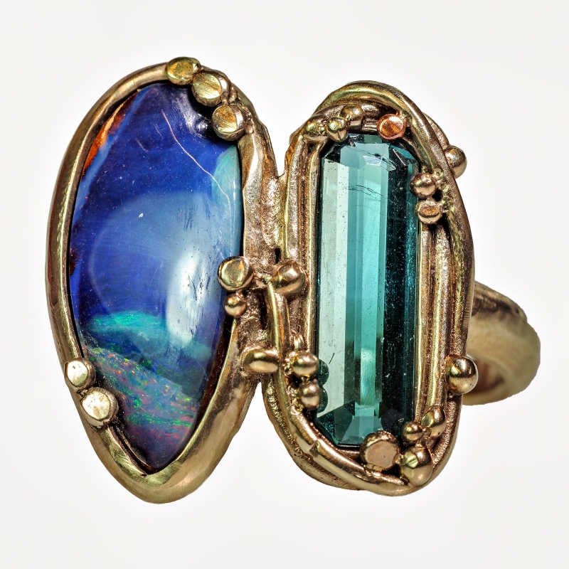 White gold ring Boulder opal and tourmaline