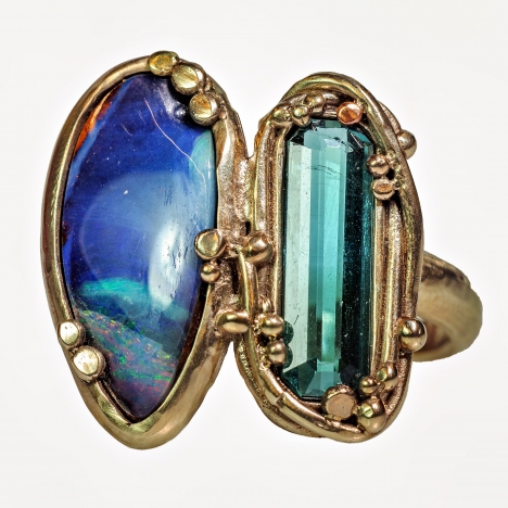 One of a kind 14k white gold ring with two presicion cut tourmaline: one in paraiba color, another dark blue. Heart on the back side of the band.