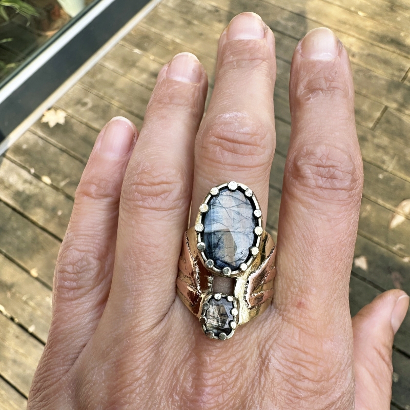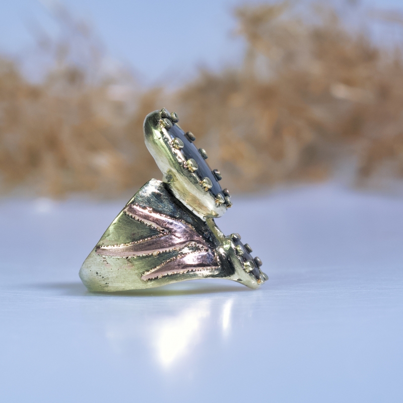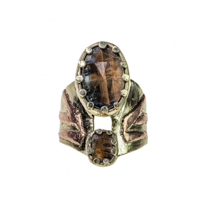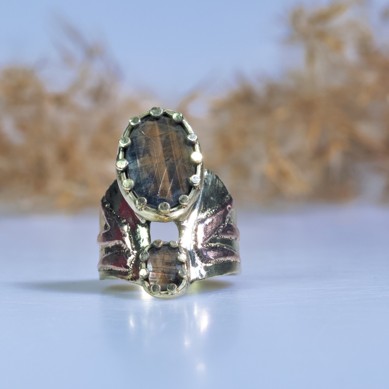 One of a kind 14k yellow gold ring with two extremly rare Gold Sheen sapphires. These specific variety of sapphire comes from depleted mine in Kenya. This stone has a great value and it is a good investment opportunity because his price is increasing. It is considered as a second rarest gemstone in the world. I will be happy to send video of this powerful ring, pictures don't show how beautiful Gold Sheen sapphire is. Ring is from yellow gold with rose gold details on the band. If you would like to have similar ring but it is not your size, contact me please.
