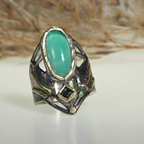 One of a kind epic ring with natural surface cobalto-calcite in pink and green colors and two green sapphires. 14k gold details around the stones and "hearts" on the structure band. Oxidized.